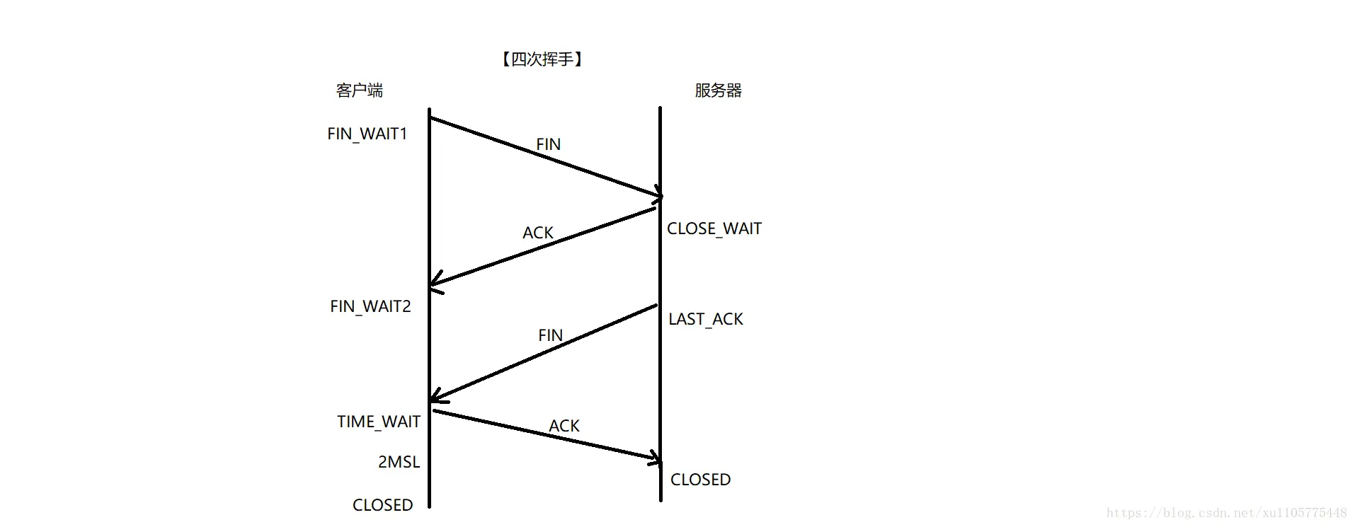 - 第四次挥手:当客户端收到服务器发来的请求断开连接报文后,客户端会向服务器发送一个确认报文,随即进入TIME_WAIT状态,并且会等待2MSL(MSL:最大报文生存时间),如果在2MSL里面服务器没有收到客户端发来的ACK,那么服务器就会重新发送一个FIN报文,此时客户端又会发送一个ACK报文并会重新等待2MSL.如果服务器收到客户端发送的ACK报文,此时服务器就会进入CLOSED状态,2MSL之后,客户端也进入CLOSED状态。可以看到服务器比客户端先进入CLOSED状态。