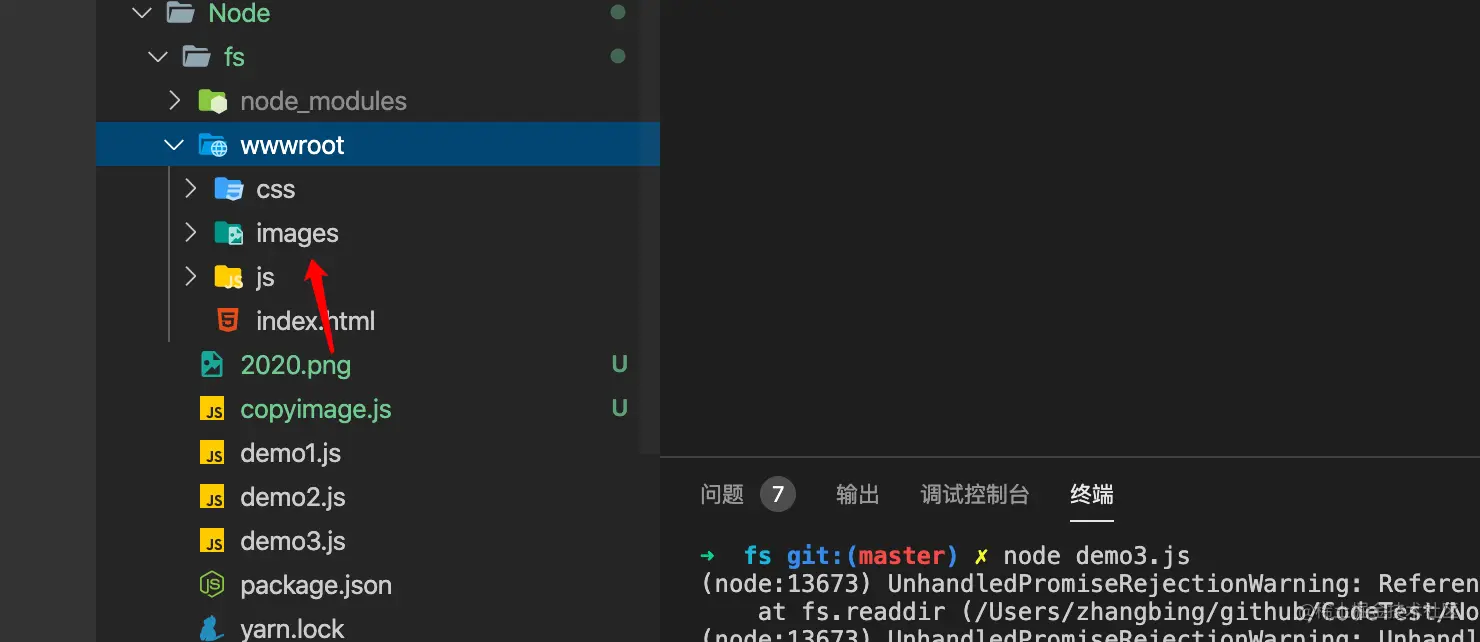 需要特别注意的是,fs.createWriteStream 要写入的目录一定要带上要复制的文件名,也就是不能写成 fs.createWriteStream('./wwwroot/images/') 否则在 macOS 下会报如下错误: