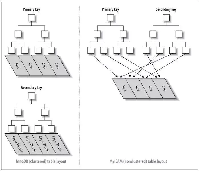 MySQL中最常见的两种存储引擎分别是MyISAM和InnoDB,分别实现了非聚簇索引和聚簇索引。