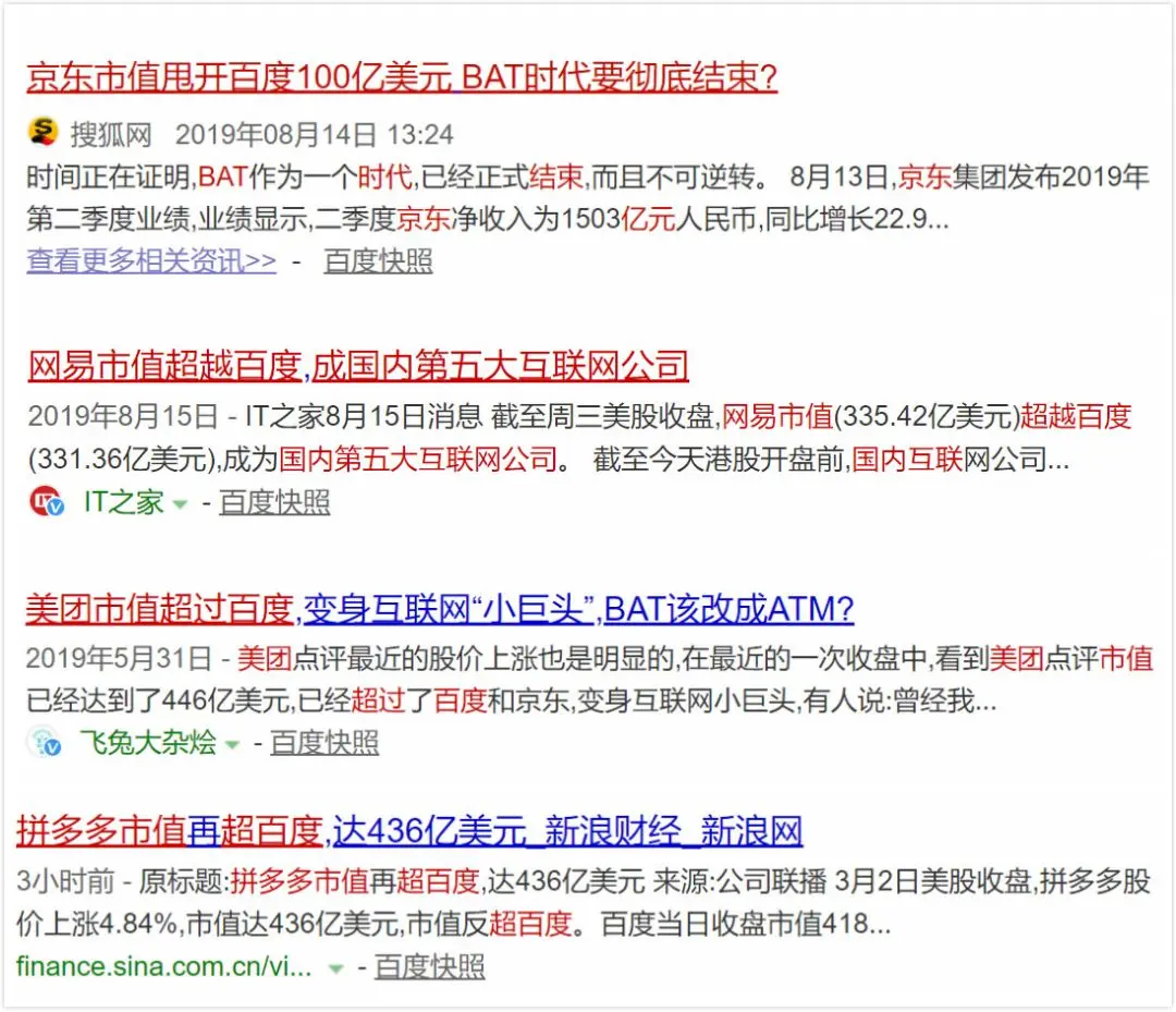 美股大跌,很多人想看看互联网公司又有什么新行情。结果没看到什么不一样,又在新闻资讯中看到了熟悉的身影:京东/网易/拼多多市值超百度。去年以来,这样的新闻隔三岔五出现,让人怀疑这些公司是不是商量好了,组团儿来黑百度。