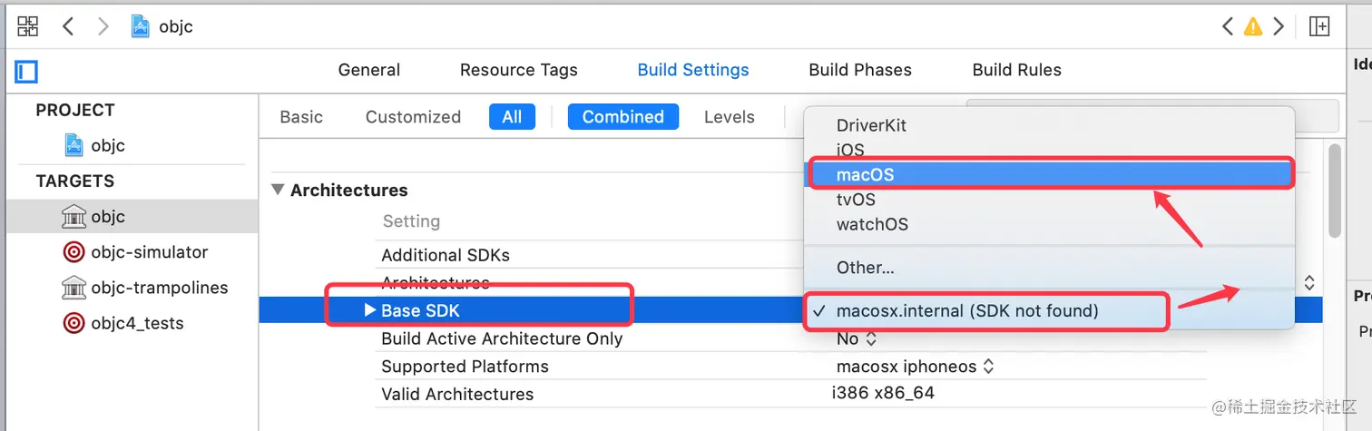 打击选择 target -> objc -> Build Settings -> Base SDK -> 选择 macOS 让系统给你进行匹配
