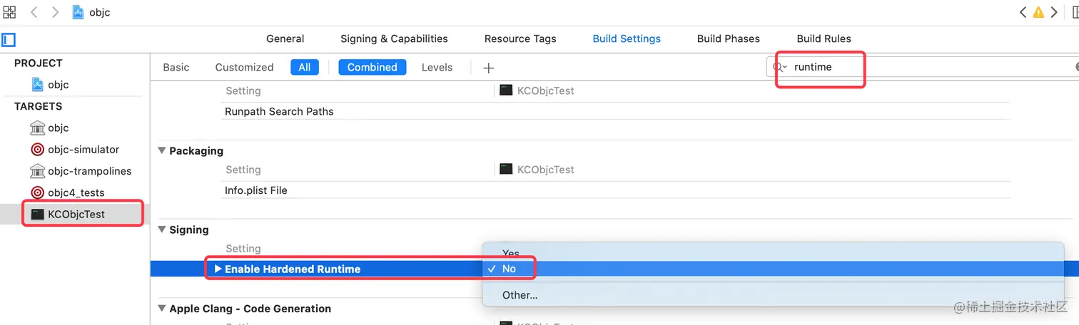 target -> objc -> Build Settings -> Enable Hardened Runtime -> NO`