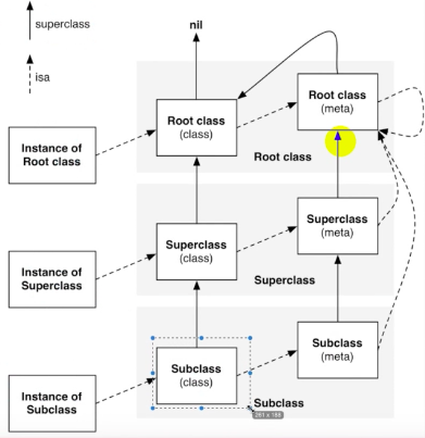 isa为指向关系 即对象的isa指向类,类的isa指向根源类,根源类的isa指向根源类自己