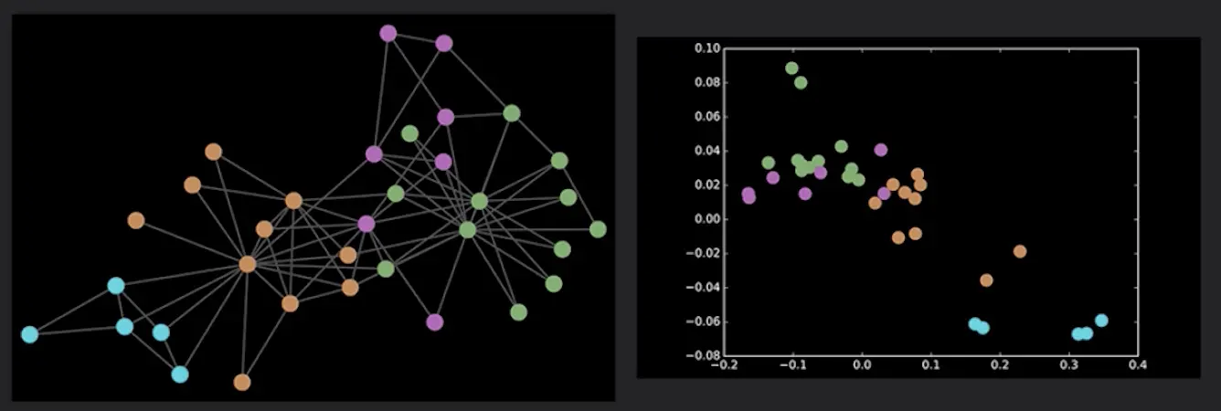 这样定义了卷积以后,整个过程就有一种很神奇的本领,比如拿跆拳道俱乐部网络举例,我们已知一些标签信息,但是我们没有告诉图卷积网络模型,它自己在一个完全随机化的初始状态下,对整个网络去做图卷积,得到了表征空间。最后我们神奇地发现,没有任何训练,只是做了一次两次图卷积以后,有些相同地标签就会自发地聚集在一起了。为什么会是这样?我们也分析过,是因为图卷积操作,它就是在捕获邻域信息,也就是这个节点跟谁相连的信息,而这些邻域信息又会在一开始就被编码在随机的权重里。因此当做了一次两次卷积以后,尽管一开始的初始化是随机的,但这种邻域信息在不同的节点上就会逐渐表现出来。所以我们会发现做了一步卷积操作以后,网络好像就可以自动地对这些节点做聚类,这是很神奇的一个特性。