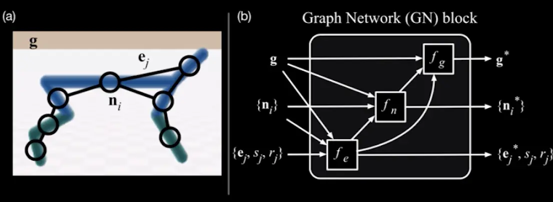 我们知道在物理学中,力学上有各种复杂的动力学传导过程,这些动力学的传导过程,就可以完全给它编码成一组连边上的向量。还有一些全局信息,比如说外界给它的这种指令,或者是它的一些整体的表现,整体的速度,整体的位置等等,这是属于全局的信息,编码到g里边。于是机械狗就可以建模成一个图网络。(如图4(b))