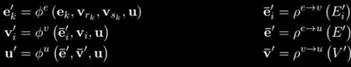 其次,当做完前馈运算以后,它也会进行反向传播的学习,刚刚我们也说到它的每一步运算都是可微分的,这就是一个普通的前馈神经网络的过程。也就是它把前馈神经网络放在了每一个环节,比如连边上有一个,节点有一个,全局可能还有一个等等。这样就导致了它就可以对结构进行概括,并通过反向传播算法进行学习,从而更新映射函数,使得整个网络架构变成了一个可学习的架构。