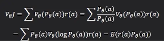 如果你玩过强化学习,都会知道policy gradient。在强化学习中,可能前面复杂的神经网络都是可微分的,但总是会有最后一步:依概率去选择一个行动(action),最终针对每个选择都会有一个评价(奖励或者惩罚),这个选择的过程就会导致梯度信息丢失。在强化学习中解决这个问题的方法就是policy gradient。它是用一个概率期望来去替代评价函数,也就是说并不是每一次最后选择一个action,就给一个回报去学习,而是要做多次选择,这样的话就可以产生一个期望。当你把这个期望经过这样的一个公式,最后期望的梯度就完全变成是一个可微分的,从而可以继续梯度反传。
