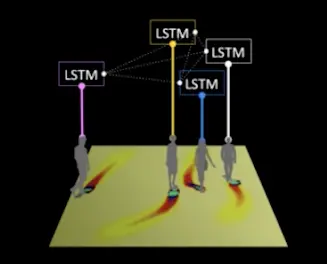 首先李飞飞他们组,他们做的一个工作很有意思,题目叫social LSTM。我们知道在多主体领域有一个著名的社会力模型。比如说这个会场突然说着火,大家就会拥挤着去冲出门。那么用多主体的方式把这个现象模拟出来就是社会力模型(social force)。李飞飞就是呼应这个,给自己的模型取了个名字叫social LSTM,他们的模型不仅仅是有多主体,而且多主体可以去自学习,最后的结果会非常精确的去逼近每一个人运动轨迹。