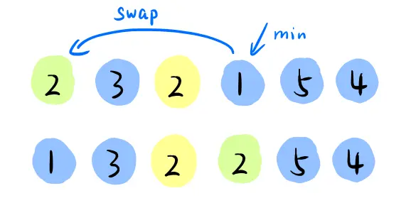 比如下图的这组数据,使用选择排序算法来排序的话,第一次找到最小元素 1,与第一个2 交换位置,那前面的 2 和后面的 2 顺序就变了,所以就不稳定了。