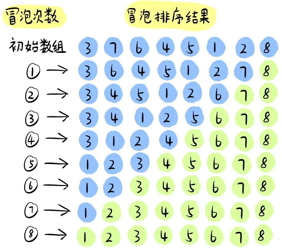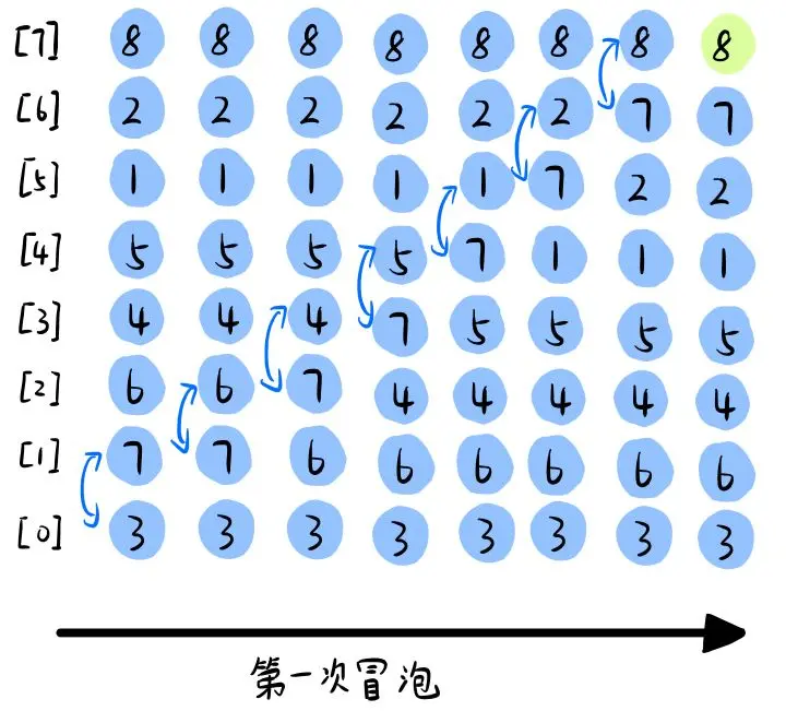 冒泡排序和插入排序和选择排序不太一样。冒泡排序每次只对相邻两个元素进行操作。每次冒泡操作,都会比较相邻两个元素的大小,若不满足要求,就将它俩交换。每一次冒泡,会将一个元素移动到它相应的位置,该元素就是未排序元素中最大的元素。