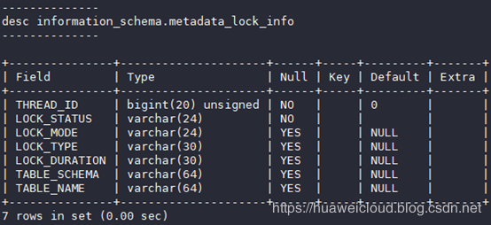 MDL 锁视图以系统表的形式呈现,该表位于INFORMATION_SCHEMA,表名:METADATA_LOCK_INFO,表结构如下: