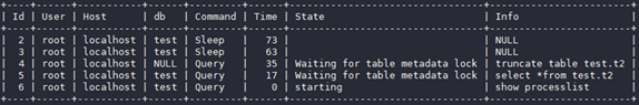 </tr></tbody></table><p><span style="color:#000000;">客户发现表t2的truncate一直被阻塞后,业务流程中对表t2的select操作也全部被阻塞。DDL被阻塞后,客户立刻执行show processlist:</span></p>