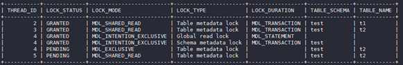LOCK_TYPE :MDL锁的类型,如Table metadata lock、Schema metadata lock、Global read lock、Tablespace lock等