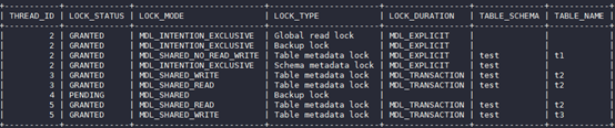 引入MDL锁视图后,客户执行SELECT * FROM INFORMATION_SCHEMA.METADATA_LOCK_INFO: