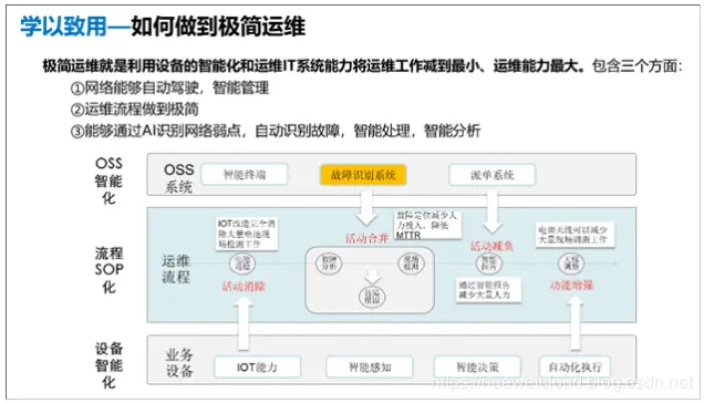 AI产品很多时候不单单是AI技术本身,更多的时候体现为一个复杂系统,AI只是其中的一个关键环节。以一个故障处理AI OSS产品为例,故障处理是一个系统的工作,会涉及到物理设备智能化、业务流程优化、OSS自身产品的协同。还有系统架构,软件架构,易用性,生态等多个方面的考虑。下面是极简运维的框架图,AI只是其中一部分工作。