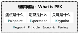 理解了业务特点之后,还要理解业务问题是什么,就是下面的PEK模型。前面的痛点和期望比较好理解,最后的关键点需要注意一下,业务既然存在了很长时间,存在的问题没有解决一定有其原因,不会无缘无故的没人解决问题。这些原因就是关键点,一定要了解清楚是技术门槛原因(在技术原理Principle上就存在障碍),还是因为经济原因(Economic),还是因为工作习惯原因(人的感受习惯了Feeling)。