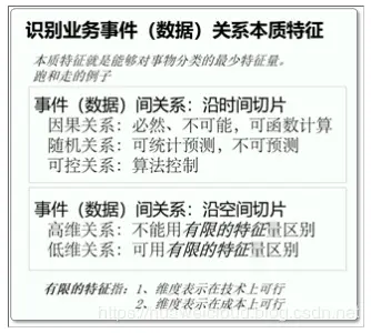 业务理解完了,就要抽象出解决问题的业务数据模式是什么了。这个时候特别需要业务专家知识输入,要根据现实世界的关系理解数据并建立业务数据模型。现实世界的事物关系从本质特征讲,就有两大类关系,一个是沿着时间维度的关系,包括因果关系,随机关系,可控关系三种,前两者好理解,可控关系是指通过计算机算法控制的关系,一般AI并不涉及。一个是沿着空间维度的关系,如低维关系和高维关系。比如人长相区别无法用语言准确描述,几十亿人,每个都不一样,这时候语言都是苍白的,这个就是高维模式。而象商品种类这类用有限的语言就能相对准确描述的就是低维度关系。跑和走的关系比较特殊,大家可以考虑一下是什么关系?我总结了事件间关系,见下图分类。