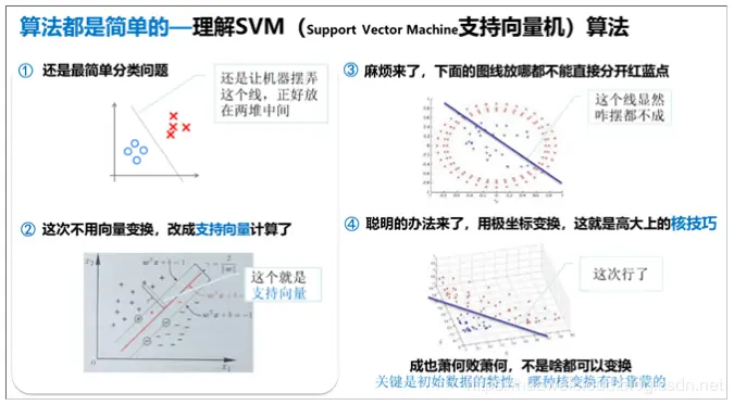 SVM是一种分类算法,如果能够理解下面二维图的原理,高维数据推而广之就行了。按照前面对业务数据的理解方式,要确定数据本身是可分的,如下图中①所示,显然从数据间关系看是线性可分的,这种情况就比较简单了,如②所示,用算法找出最合适的分割面就行了。最关键的是如果像③的情况,数据分为里外圈,显然是可以区分的,但数据又不能用一根线分开。这个时候,可以通过极坐标变换变成④的情况,就又可以用一条线分开了。这种变换如果在高维上应用就是核变换。