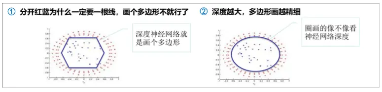 理解完SVM,我们理解一下深度学习,还是上面那个例子,在SVM方法中是对数据进行了变换。而深度学习的方法是不对数据处理,而是通过画多个线段的方法把内外圈分隔开。这样就避开了SVM要靠蒙各种变换的尴尬。方法比较统一,这样算法选择就比较容易了。对高维数据也一样,只要数据本身是可分的,只要深度学习的神经网络设计够复杂,就不会走到死胡同。