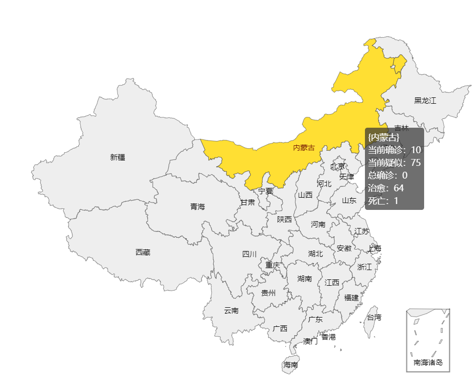 引入数据,这里要注意name不能为item.provinceName而是item.provinceShortName,因为根据文档,数据对应的地图区域的名称,例如广东,浙江,应该是shortName