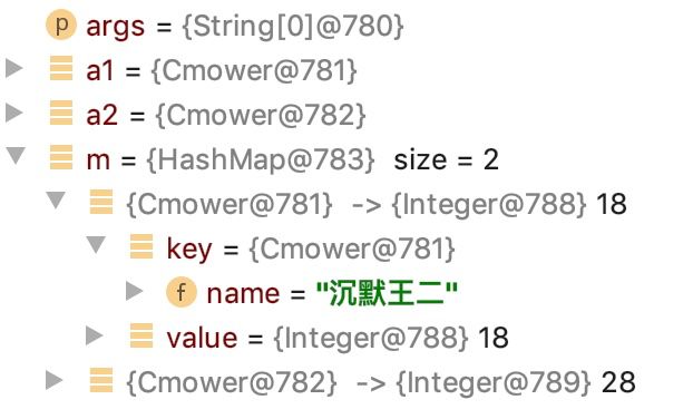 public class Cmower { private String name; public Cmower(String name) { this.name = name; } @Override public boolean equals(Object obj) { if (obj == null) return false; if (!(obj instanceof Cmower)) return false; if (obj == this) return true; return this.name.equals(((Cmower) obj).name); } public static void main(String[] args) { Cmower a1 = new Cmower("沉默王二"); Cmower a2 = new Cmower("沉默王三"); Map<Cmower, Integer> m = new HashMap<Cmower, Integer>(); m.put(a1, 18); m.put(a2, 28); System.out.println(m.get(new Cmower("沉默王二"))); }}