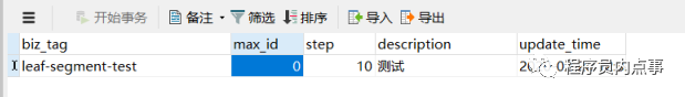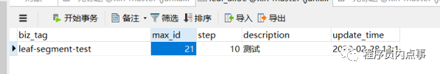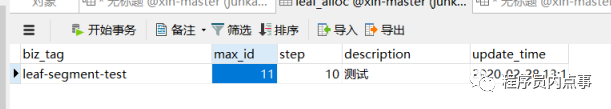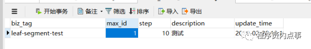 访问:http://127.0.0.1:8080/api/segment/get/leaf-segment-test ,结果正常返回,感觉没毛病,但当查了一下数据库表中数据时发现了一个问题。