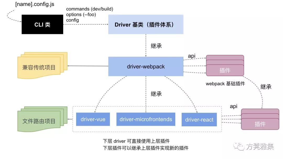 这样的能力,机智如你,应该想到了中台的概念,对的,他提供了 CLI 中台 的能力,你可以直接使用上层 driver 快速定制出适合自己场景的工程化工具,而且上层 driver 的生态你也是完整拥有的(典型的比如 driver-webpack,你可以定制出 driver-vue/driver-react/driver-microfrontends,同时 driver-webpack 这一层所有的插件你也是可以直接继承过来的)