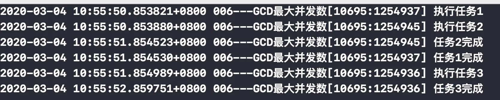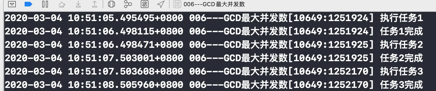 将dispatch_barrier_async函数改为dispatch_barrier_sync,然后运行程序: