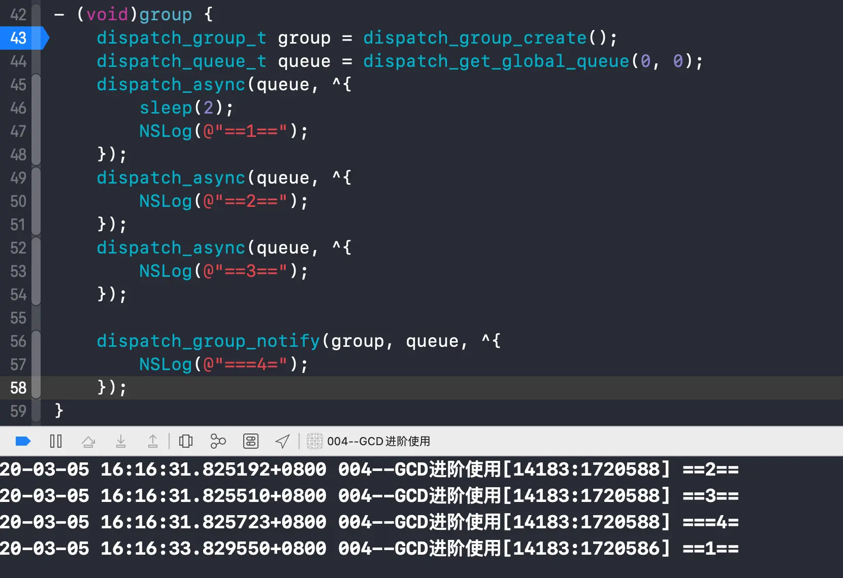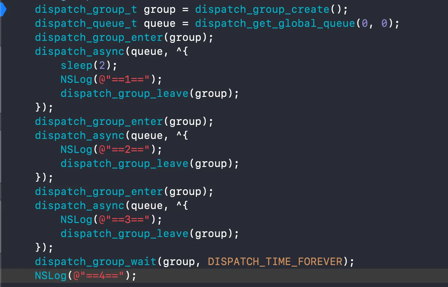 但是dispatch_group_wait会阻塞之后的操作,比如我们在组通知之后还执行了NSLog(@"==5=="),组任务并没有阻塞到它的执行,而dispatch_group_wait就会阻塞。