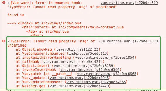 如图所示,控制台依然报错,msg未定义,原因是:mian.js此时尚未加载,拿不到当前vue实例。