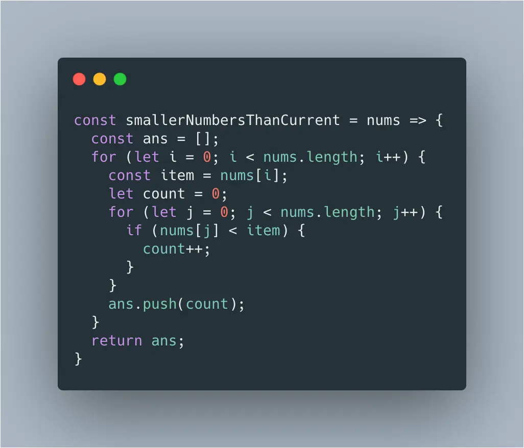 给你一个数组 nums,对于其中一个元素 nums[i],请你统计数组中比它小的所有数字的数目。 换而言之m,对于每一个 nums[i] 你必须计算出有效的 j 的数量,其中 j 满足 j != i 且 nums[j] < nums[i]。 以数组的形式返回答案。