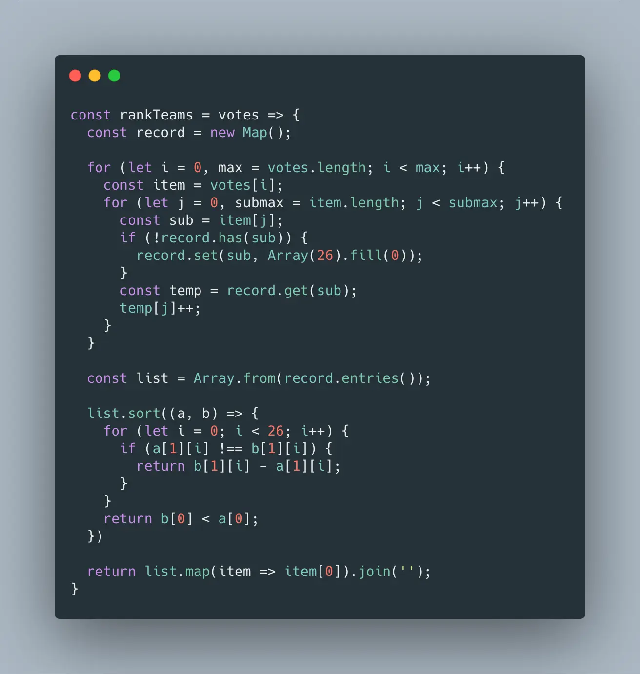 因为最多有 26 支参赛队伍,所以需要在排序时优先根据 26 种排名数量来排序参赛队伍,如果获得 26 种排名的情况一致,那么需要再比较一下参赛队伍的字母顺序。