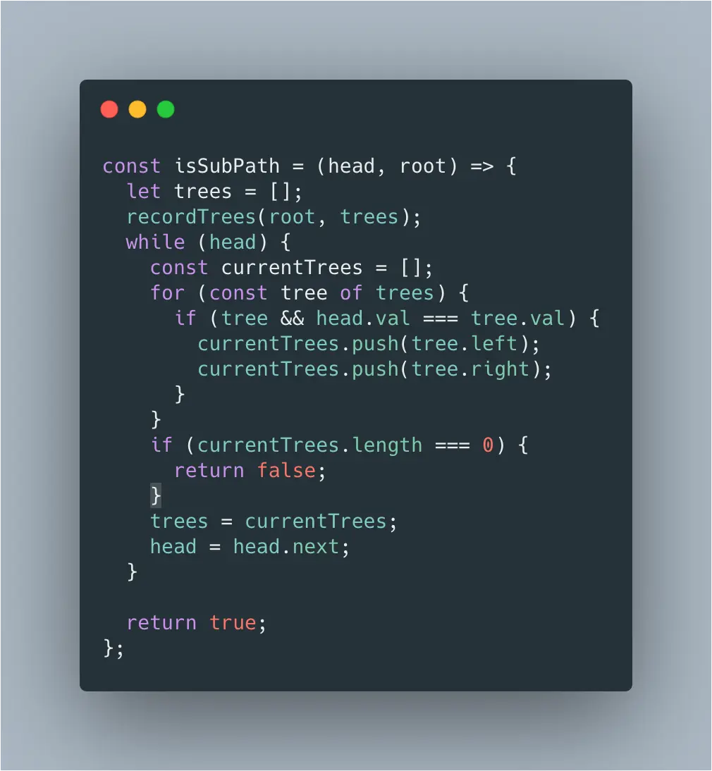 获取到子树根节点之后,遍历链表即可验证是否存在一直向下的路径,遍历链表采用迭代 next 指针完成。