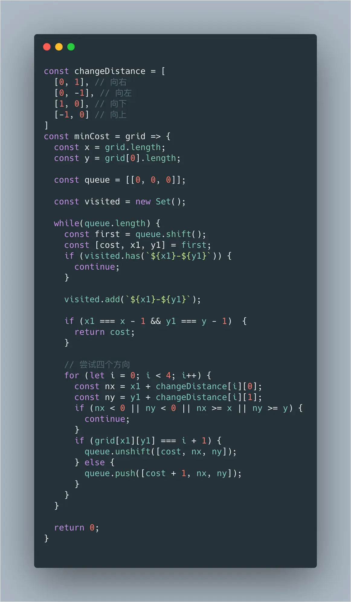 给你一个 m * n 的网格图 grid。grid 中每个格子都有一个数字,对应着从该格子出发下一步走的方向。grid[i][j] 中的数字可能有以下几种情况: 1、下一步往右走,也就是你会从 grid[i][j] 走到 grid[i][j + 1]。 2、下一步往左走,也就是你会从 grid[i][j] 走到 grid[i][j - 1]。 3、下一步往下走,也就是你会从 grid[i][j] 走到 grid[i + 1][j]。 4、下一步往上走,也就是你会从 grid[i][j] 走到 grid[i - 1][j]。 注意网格图中可能会有无效数字,因为它们可能指向 grid 之外的区域。 一开始,你会从最最左上角的格子 (0,0) 出发。我们定义一条有效路径为从格子(0,0)出发,每一步都顺着数字对应方向走,最终在右下角的格子(m - 1, n - 1)结束的路径。有效路径不需要是最短路径。 你可以花费 cost = 1 的代价修改一个格子中的数字,但每个格子中的数字只能修改一次。 请你返回让网格图至少有一条有效路径的最小代价。