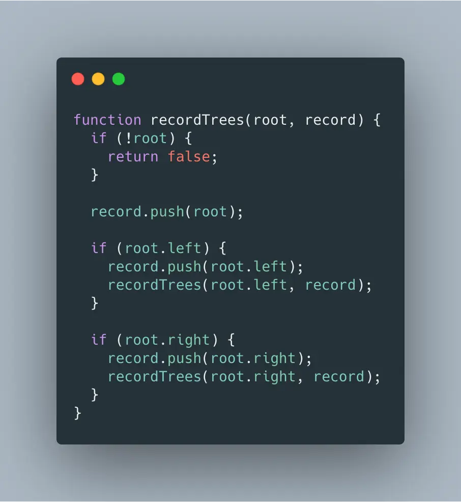 题目要求验证二叉树中是否存在一条一直向下的路径,那么我们可以从二叉树中任意子树的根节点开始尝试,所以需要先记录二叉树所有子树的根节点,实际上就是遍历二叉树操作,一般采用递归思想处理。