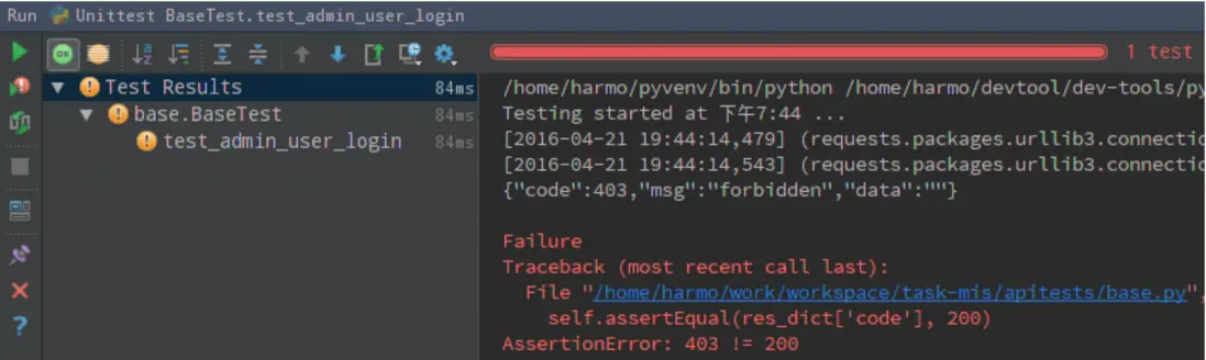 通过上面运行结果的提示,我们可以看出,指定的数据输入经过服务端接口后,并没有返回我们期望的值。这个时候,我们就可以排查是不是服务端的接口出问题了,或者是谁修改了测试数据,导致结果不符合预期。