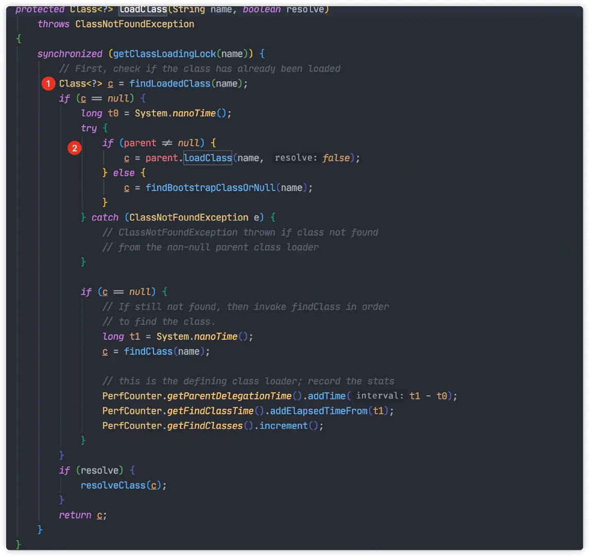 类加载的核心源码位于 ClassLoader#loadClass: