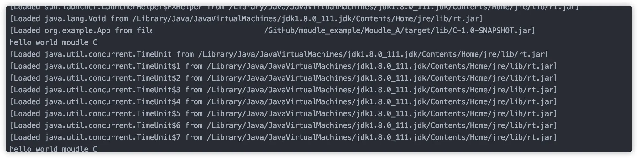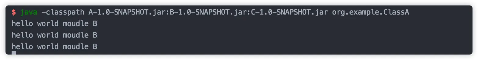 java -classpath A-1.0-SNAPSHOT.jar:B-1.0-SNAPSHOT.jar:C-1.0-SNAPSHOT.jar org.example.ClassA