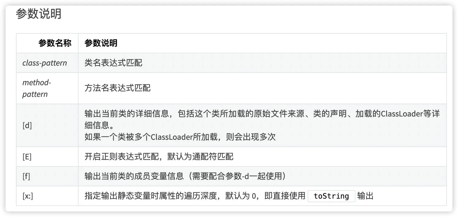 sc 命令是 Search-Class 简写,这个命令能搜索出已经加载到 JVM 中的 Class 信息,支持参数如下表格所示。