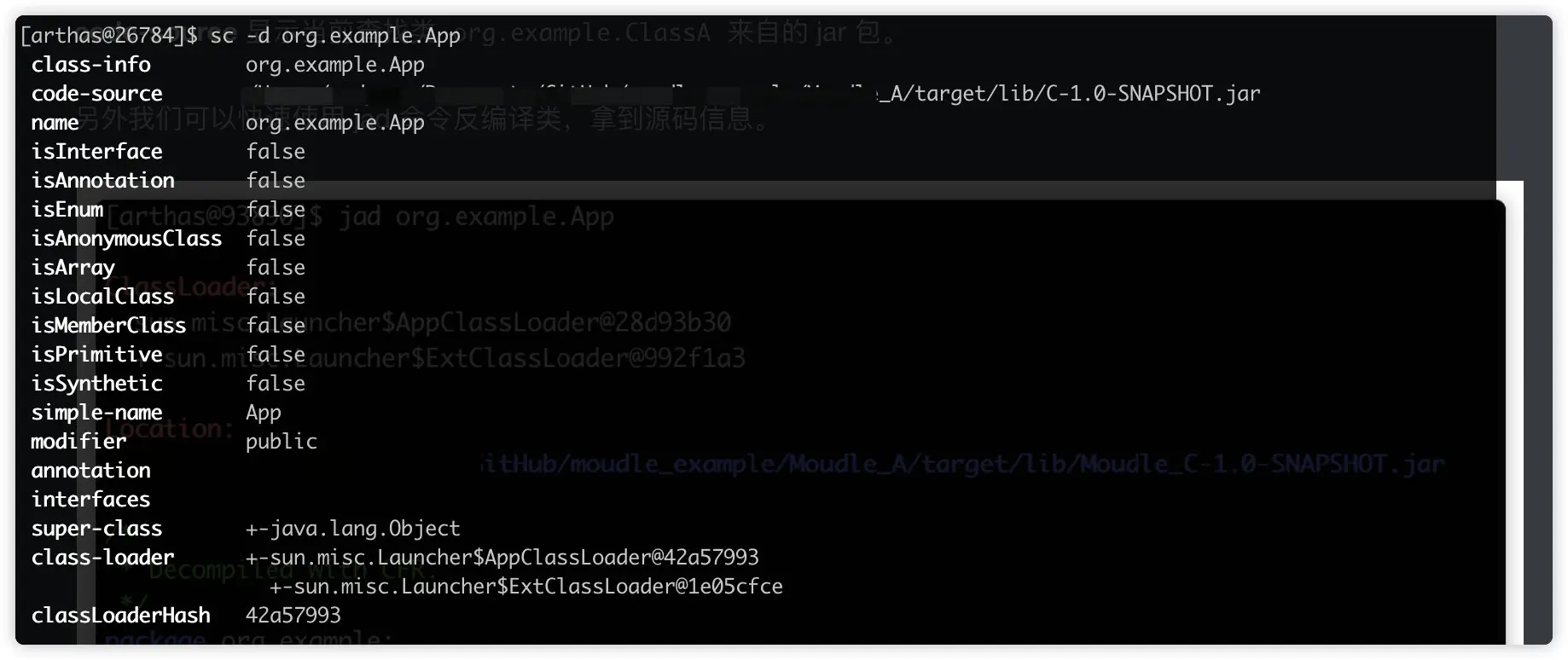阿里开源项目 Arthas sc 命令可以用来查找加载类的信息。。