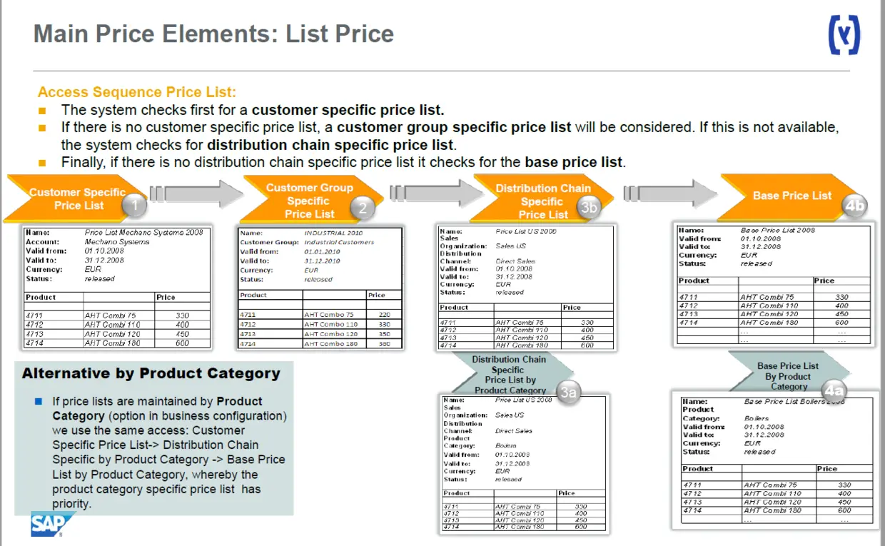 (1) 首先检查是否维护了客户专属的价格列表(customer specific price list ) (2) 如果没有,再检测是否存在客户组专属价格列表(customer group specific price list) (3) 检查是否存在基于特定的销售组织和分销渠道的价格列表(distribution chain specific price list) (4) 如果上述检测都检查不到对应的记录,最后使用Product工作中心中维护的基本价格列表(base price list)。