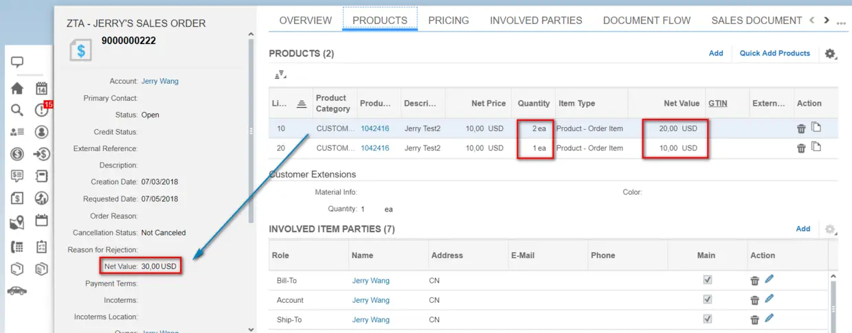 我添加了2个行项目,总共数量为3个,所以最后Sales order抬头的net value为3 × 10 = 30美元。