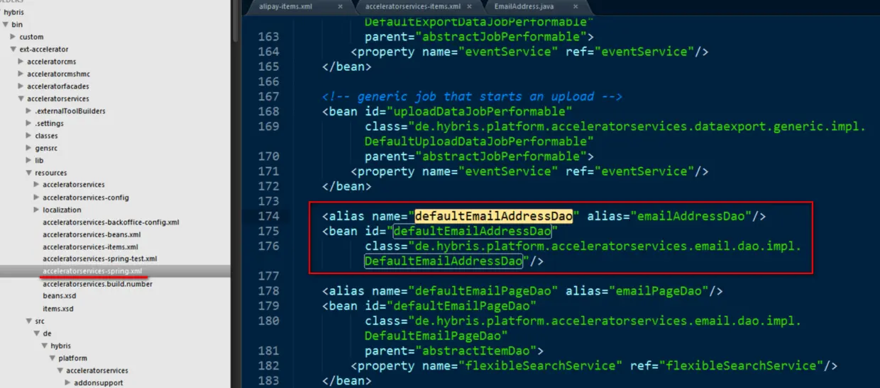 这里的flexible search就相当于ABAP的OPEN SQL, 把DB的access同具体的DB provider解耦。 runtime时具体用哪个DAO的实现,是在Spring的配置文件里注入的: