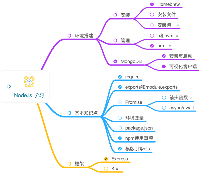 这个思维导图肯定不是标准的Node.js 学习内容,只不过是应对我本次基础的学习,后续的学习会不断对这个思维导图进行修正的