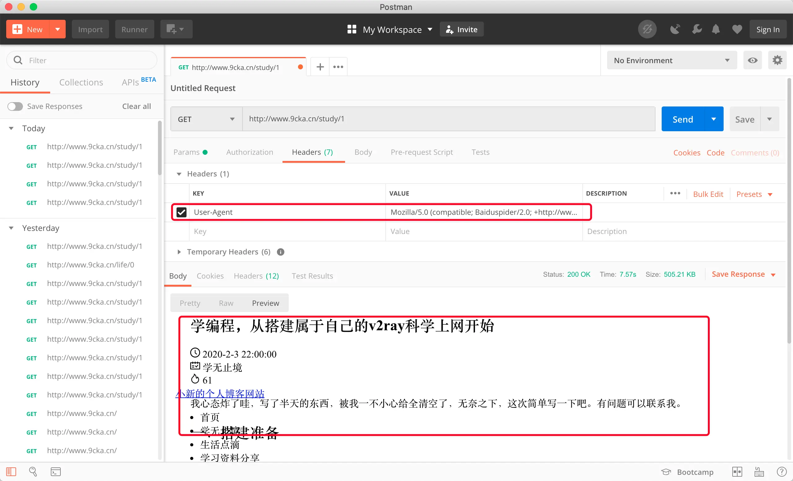 我使用postman进行测试,使用爬虫UA进行测试,返回结果如图,看到获取到了完整的html,包括ajax请求的数据,这样爬虫就可以抓到数据了。