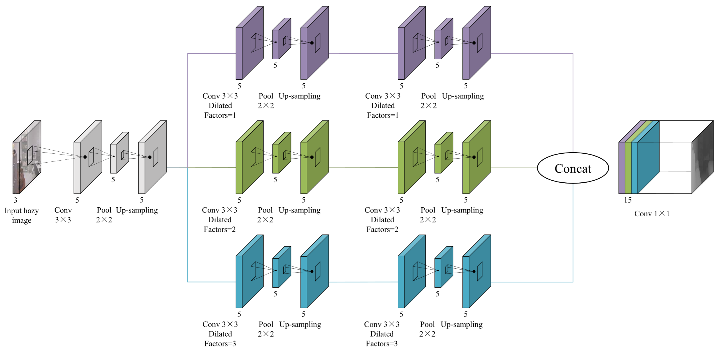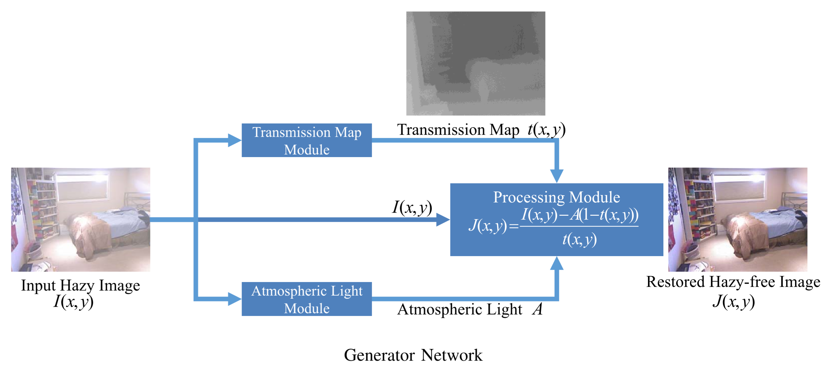 首先文章认为以往的基于学习的去雾一般为,估计A,估计t,然后就反向传播了。这样的计算方式孤立了A和t的估计,如果能够对它的去雾结果J计算一个loss来反向传播会更好。