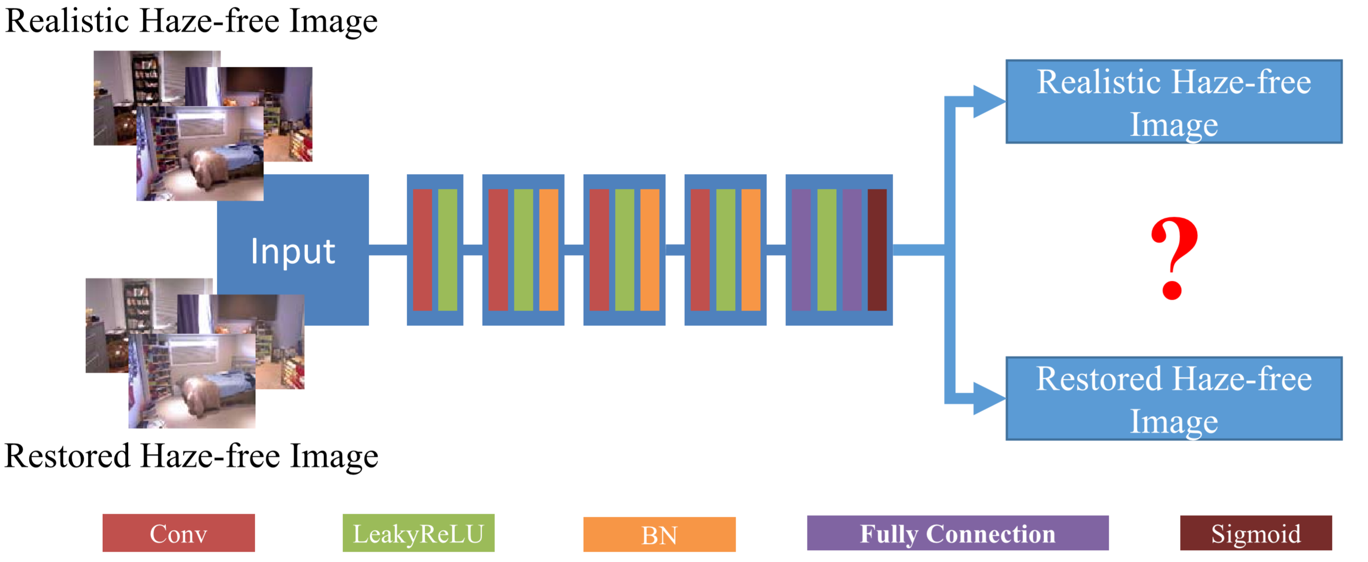 一次只输入一张图像,输出结果是判断输入图像是真实场景的图像还是去雾网络的去雾结果。