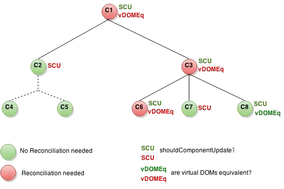为了进一步说明问题,引用官网的图解释一下,如下图( SCU表示shouldComponentUpdate,绿色表示返回true(需要更新),红色表示返回false(不需要更新);vDOMEq表示虚拟DOM比对,绿色表示一致(不需要更新),红色表示发生改变(需要更新))