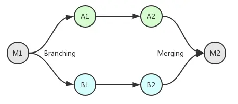 如上面那张图,当 A 功能 和 B 功能 都开发好了之后,分别为版本 A2 和版本 B2,需要将两者整合在一起,产生新的版本 M2,这个整合的过程就是合并。