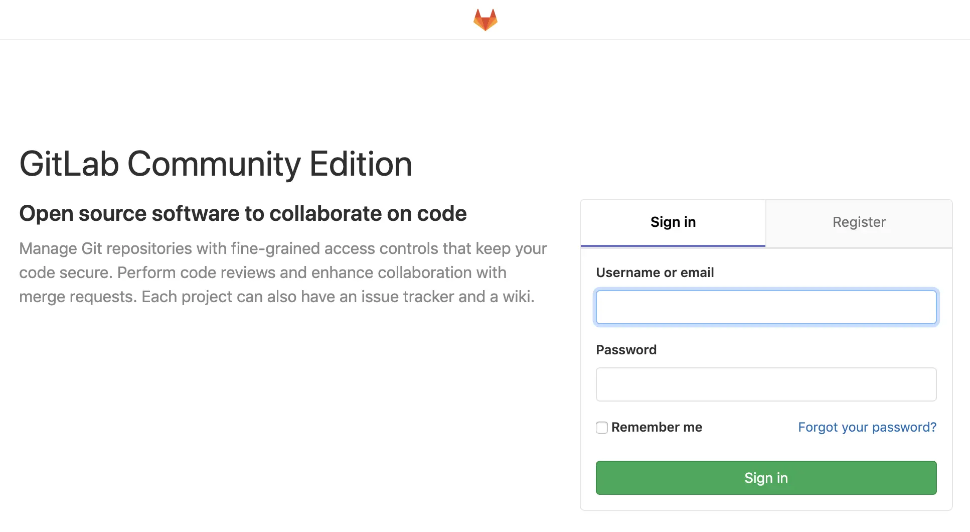 稍微等待几十秒,在浏览器中输入 http://localhost 就可以看到 GitLab 的登陆页面了。